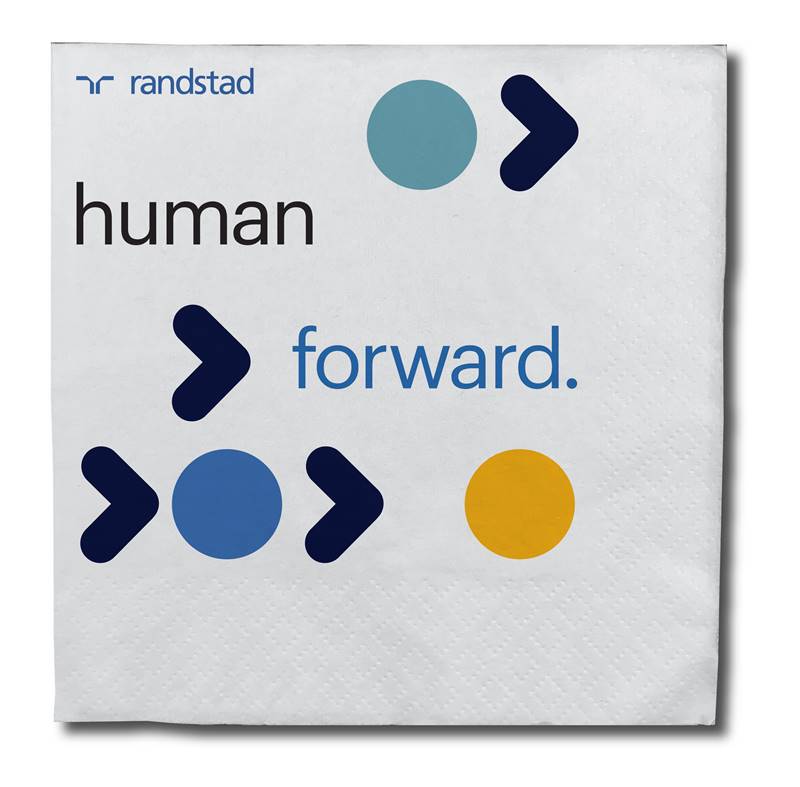 These napkins are made with 2-ply, bright white, facial-grade virgin tissue paper featuring decorative coin-edge embossing. Measures 5" x 5" (10 x 10 unfolded). Printed with the Randstad Human Forward art. Sold as a pack of 36 napkins.